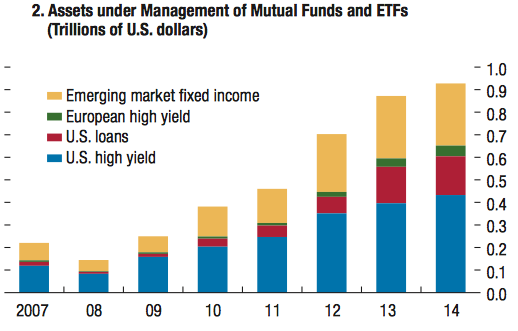Here is how much growth has been experienced in assets under management for mutual funds and ETFs, showing the increasing level of United States high yield bonds (in blue):