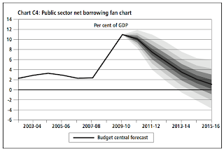 To keep track of public finances, the coalition government created the Office for Budget Responsibility (OBR) whose mission it is to independently assess the economy, control economic forecasts and make key judgments that drive official government economic projections most particularly for each Budget and Pre-Budget Report.  All this for only £1.75 million per annum!  Here’s their fiscal forecast for the 2010 Budget showing that they expect the United Kingdom’s finances to return to balance by 2014 – 2015 and surplus by 2015 – 2016 from a deficit of 5.3 percent of GDP in 2009 – 2010.  The OBR also assesses the probability of actually reaching the government’s debt and deficit targets; their forecast shows that the government has a greater than 50 percent chance of actually meeting its targets for the period from 2014 to 2016 which, if you look at it realistically, means they have roughly a 50 – 50 chance of doing what they say they will do.  It may be just me, but that indicates to me that the forecast is relatively meaningless and that a coin toss would just as easily predict whether or not the government’s targets are met.  Here’s the fan chart showing their borrowing as a percentage of GDP projections for the next few years.  Note how wide the fan becomes the further out in time they project data indicating growing uncertainty: