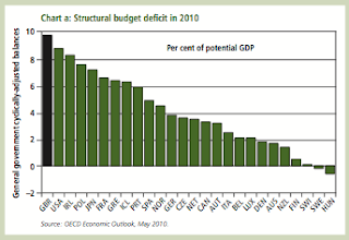 “The fiscal challenge in the UK is, on some measures, larger than in any other advanced economy. In May, the International Monetary Fund (IMF) forecast that UK public borrowing would be the highest in the G20 in 2010; it is also estimated that the UK’s structural deficit will be the highest among all OECD countries and the 27 EU Member States. The rating agency Fitch has pointed out that “the rise in public debt ratios [in the UK] since 2008 is faster than for any other ‘AAA’-rated sovereign.”
