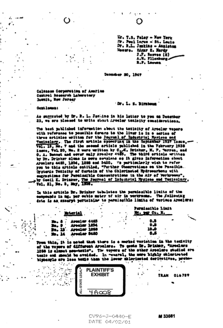 As well, this internal document dating from December 1947 from instant to the Celanese Corporation states that experiments with Aroclor in the 1930s led to liver damage in rats and that the "…vapors of the other Aroclors (other than Aroclor 1268) are toxic and should be avoided.":
