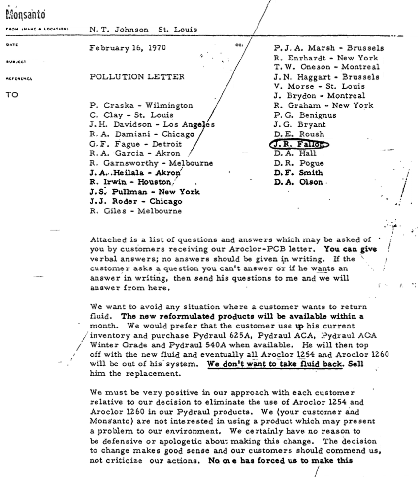 Note the first sentence of the last paragraph which states "…we can't afford to lose one dollar of business.". Also note that customers who were asking questions about Monsanto's Aroclor/Pydraul hydraulic fluid products were to be given verbal answers only and that no written answers were to be provided. As well, no fluids were to be taken back from customers, rather, newly formulated fluids that were less damaging to the environment were to be sold to the customer.
