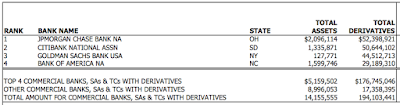 In other words, the four "too big to fail" banks have exposure to derivatives that is more than 14 times the total value of their assets.