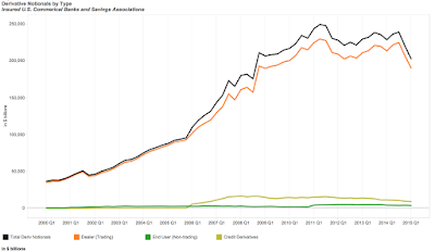 According to the most recent quarterly report from the Office of the Comptroller of the Currency (OCC), a total of 1427 insured U.S. commercial banks and savings associations reported derivatives activities at the end of the first quarter of 2015. The use of derivatives by the American banking system is dominated by the four largest commercial banks which represent 91.3 percent of the total nominal value of derivatives issued. By far, the largest volume of derivative contracts are related to interest rates followed by foreign exchange and credit derivative products as shown on this table: