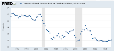 It is interesting to see how consumer debt, particularly credit card debt, has reached post-Great Recession highs and how consumer credit inquiries are up. It appears that the current and prolonged low interest rate environment has lulled consumers into a false sense of credit reality. As we can see on this graph from FRED, the current average interest rate of 12.04 percent on commercial bank credit cards is among the lowest in the last two plus decades: