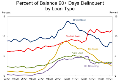 In the second quarter of 2015, credit card balances increased to $703 billion with 8.4 percent of balances delinquent by 90 days or longer. Here is a graph showing how the percentage of credit card delinquent balances (in blue) have begun to rise over the last two quarters:
