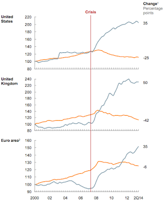 3.) Eighty percent of countries in the study had higher household debt levels in Q2 2014 when compared to Q4 2007 with 74 percent of household debt being mortgages in advanced economies and 43 percent of household debt in developing economies.