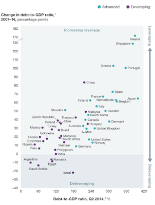 Here is a graphic showing what the change in debt-to-GDP ratio looks like for each nation between 2007 and 2014: