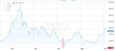 Japan's public debt-to-GDP ratio of 234 percent is the highest in the world, beating even Greece which has a ratio of 183 percent and Italy which has a ratio of 139 percent. Japan certainly offers us a glimpse of what could happen in many nations around the world where governments have no hope of or particular interest in reducing their debt levels. Japan has experienced nearly a quarter of a century of moribund economic growth in a rising government debt environment. The nation's stock market is stagnant at levels that it experienced back in the mid-1990s as shown on this chart: