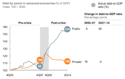 Growth in global government debt-to-GDP has increased by 35 percentage points between 2007 and 2014 compared to a growth of only 3 percentage points between 2000 and 2007. Between 2007 and mid-2014, government debt grew by $25 trillion with $19 trillion of that being accumulated by the world's advanced economies. A great deal of this has occurred because of high stimulus spending during and after the Great Recession. It is key to note that the level of public debt would be far worse if the world's key central banks hadn't kept interest rates at record low levels for a record length of time.