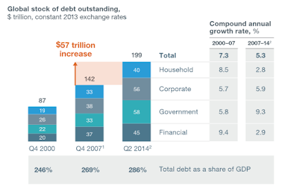 A report by McKinsey Global Institute, "Debt and (not much) Deleveraging" looks at what has happened to global debt since the Great Recession. Given that a great deal of the problem that created the Great Recession was debt-related, one would hope that the world, including individuals, corporations and all levels of government, had learned a lesson from living beyond their respective means. Unfortunately, McKinsey shows that this is clearly not the case. Global debt levels across 47 nations (22 advanced and 25 developing economies) including household, corporate, government and the financial sector, has increased from $142 trillion in Q4 2007 or 269 percent of global GDP to $199 trillion or 286 percent of global GDP in Q2 2014. This is an increase of $57 trillion or 40.1 percent in less than seven years. Here is a graphic that summarizes the debt growth by sector: