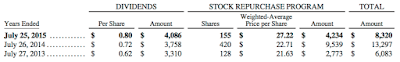 Let's look at the example of Cisco to get a sense of the size of the share repurchase and stock option issues. From the company's 2015 Annual Report we find that during fiscal 2015, the company repurchased 115 million of their own shares at an average price of $27.22 for an aggregate purchase price of $4.2 billion as shown on this table which also shows the repurchases for 2013 and 2014: