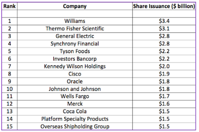 Now, let's look at the other side of the coin; stock issuance. Here is a table showing the top 15 largest companies (as measured by cash flow) by stock issuance in 2014: