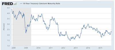 As the Fed has been telegraphing, it is planning to raise interest rates and has teased us for the past few months about the timing of the liftoff. As we can see from this yield curve showing the yield on ten year Treasuries, so far, other than a bit of a spike in mid-2013, the bond market has pretty much discounted any significant change in interest rates: