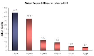 According to the Energy Information Administration (EIA), Libya has total proven reserves of 44 billion barrels of oil as of January 2010, the largest proven oil reserves in Africa. Here is a graph comparing proven oil reserves for major oil producing nations in Africa: