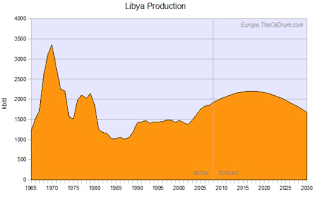 By 2003, oil discoveries totalled 52 billion barrels of which 23 billion had already been produced. At the discovery rate of 100 million barrels per year (average for the immediate previous years), Colin Campbell at the Association for the Study of Peak Oil (ASPO) estimated that Libya’s ultimate reserves will reach 55 billion barrels of oil. By 2007, over 27 billion barrels of oil had been produced meaning that the country was at or near its reserve midpoint (think peak oil).
