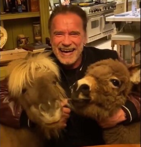We are SO envious! Due to his age and the fact that Gold’s Gym is closed, Arnold Schwarzenegger is at home trying to amuse himself and stay safe. But look who he’s keeping company with! Arnold has a miniature pony named Whiskey and an adorable little donkey named Lulu that he’s cuddling in his kitchen. Visit Arnold’s Twitter page to watch the video…