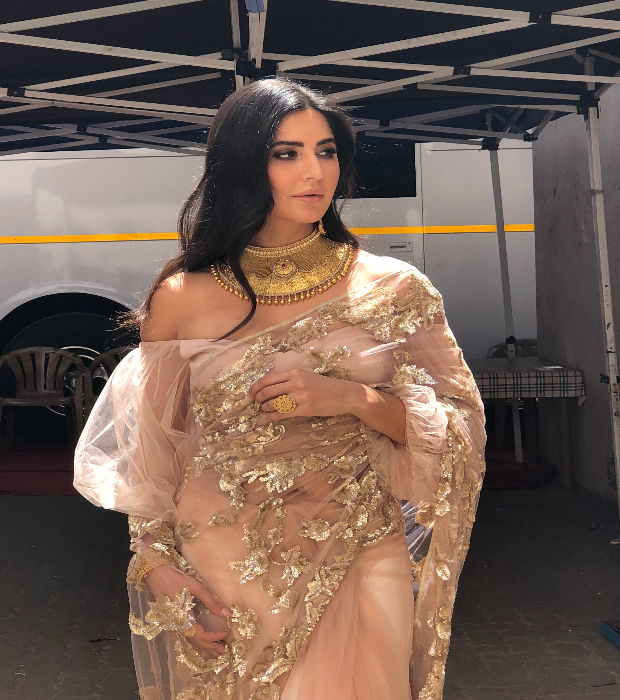 Katrina wore a tulle saree with an off-shoulder blouse in the nude tone with a gold choker and a ring complimenting the gold motifs on her saree.