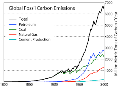 The WMO also notes that the global averaged mole fractions of carbon dioxide, methane and nitrous oxide reached new highs in 2011. Carbon dioxide levels reached 390.9 ppm, a 2.0 ppm rise from the previous year. Methane levels reached 18.13 ppb due to increased human-sourced emissions a rise of 5 ppb on a year-over-year basis. The average global nitrous oxide level reached 324.2 ppb, a rise of 1.0 ppb over the previous year. Just in case you were curious, here is a graph showing the global fossil fuel carbon emission levels since the world's economy became industrialized:
