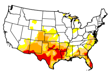 Here is NOAA's precipitation prediction for the next three months with the area shaded in light brown predicted to experience below normal levels of precipitation: