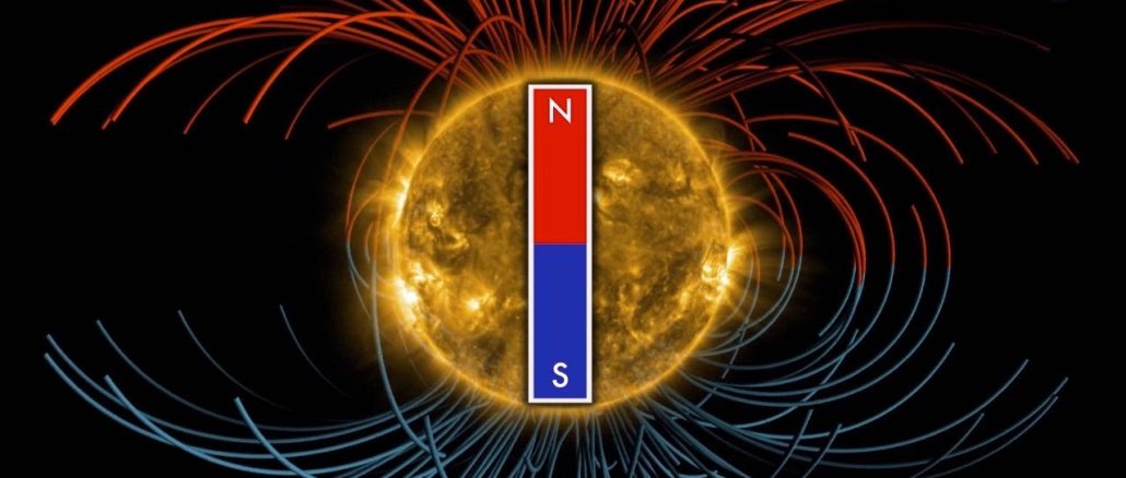 The sun’s magnetic field changes polarity approximately every 11 years. It happens at the peak of each solar cycle as the sun’s inner magnetic dynamo re-organizes itself. The coming reversal will mark the midpoint of Solar Cycle 24. Half of ‘Solar Max’ will be behind us, with half yet to come.