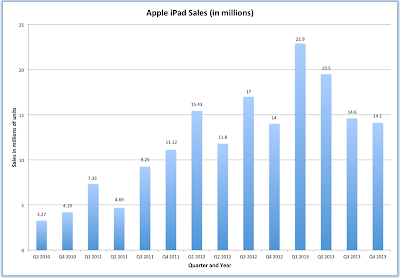 The climb in sales has been pretty steady, however, what is worrying is the decline over the second and third quarters of 2013 where sales dropped from 22.9 million in Q1 2013 to 14.6 million in Q3 2013, a total drop of 8.3 million units. With today's release, we find that sales dropped even further to 14.1 million units in Q4 2013 for a total drop of 8.8 million units on the year.