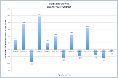 The best quarter-over-quarter gain was back in Q2 to Q3 2011 when sales rose by 97.2 percent, just after iPad 2 was introduced. Notice that from Q2 to Q3 2013, there has been a substantial cumulative drop in sales; with the release of fiscal 2013 data, there are now three quarters with quarter-over-quarter sales drops, the longest losing streak since the iPad was introduced three and a half years ago. Since unit sales peaked in the first quarter of 2013, volumes have dropped by 38.4 percent, a not insignificant amount and a trend that one would hope (if they were Apple) would be reversed soon.