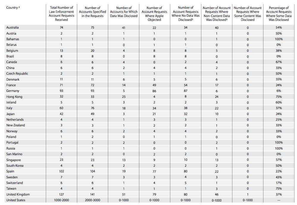 Report on Government Information Requests, noting that on on that date, Apple was only able to report United States data in bands of 1000: