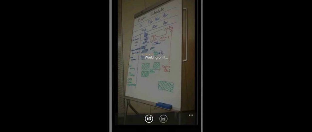 3. Take a picture using the Camera icon of the document, white board, sign or anything that has letters and numbers. Office Lens will show a box around what it thinks you want. Take your time to include the right part of the document and click the camera icon. The program will show that it is “working” on your photo.