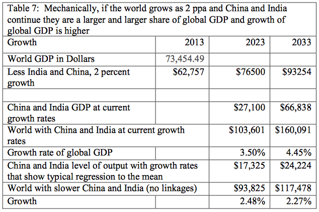 This huge difference in growth of just under $40 trillion will have a substantial impact on the global economy. Here is a table that shows the impact of changes to the growth rates of China and India to the world's economy: