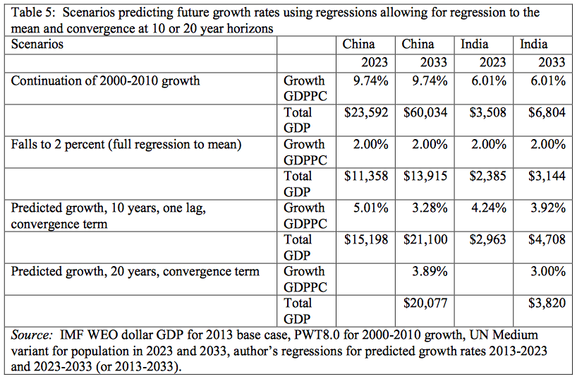 Here is a table showing the author's calculations of what will happen to the economies of China and India over ten and twenty year horizons using growth rates that are similar to the levels of 2000 to 2010 and a growth rate of 2 percent (full regression to the mean):