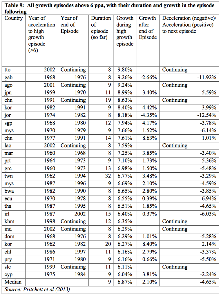 To summarize, Summers and Pritchett note that the typical (or median) end to an episode of super-rapid economic growth is nearly complete regression to the mean with that growth rate being around 2.1 percent per year. As shown on this table, the average deceleration of economic growth among all nations with growth rates that exceeded 6 percent annually is 4.65 percentage points: