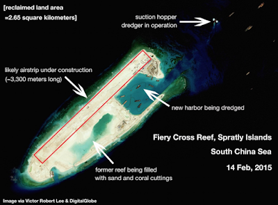 2.) Fiery Cross Reef: a new harbour has been dredged that allows quick access to waters greater than 2000 metres deep close to shore making the harbour an ideal location for a submarine base. As well, it appears that a 3.3 kilometre long runway is under construction on reclaimed land: