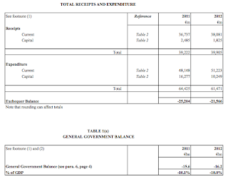 You will notice that in this summary, the budget deficit in 2012 is still projected to be 10 percent of GDP, just over three times the EU limit as noted above. Ireland needs the additional €3.8 billion in fiscal management as I noted above, to achieve the 8.6 percent of GDP.