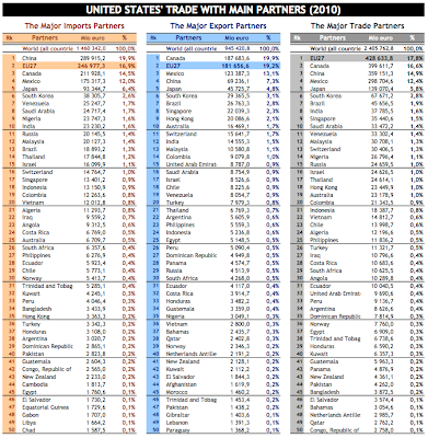 To summarize, all of these issues could well have a marked impact on the United States (and Canadian) economies. Together, the EU and the United States account for about half of the world’s GDP and about 31 percent of world trade flows. The EU imported €169.5 billion worth of goods from the United States in 2010 and €131 billion worth of services as shown here: