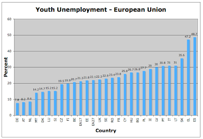 Greece’s unemployment is among the highest in the Eurozone at 18.5 percent and its youth suffer from nearly 50 percent unemployment, the second highest in the EU-27 as shown here: