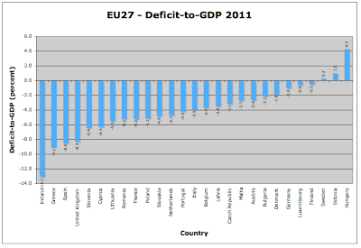 Only 10 out of the 27 nations or 37 percent of the total are within the current 3 percent deficit-to-GDP limit and only 3 have budgets that were in a surplus situation in 2011. These nations are mainly the smaller economies of the EU27 including many former Iron Curtain countries and those in Scandinavia.