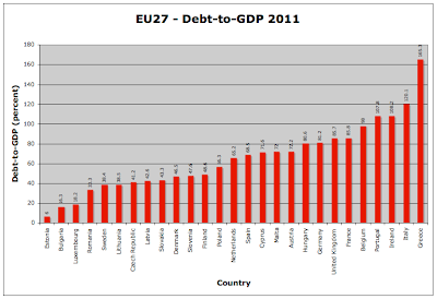 Again, only 13 out of the 27 nations or 48 percent of the total were within the current 60 percent debt-to-GDP limit at the end of 2011. As well, the less indebted nations as a percentage of GDP are those former Iron Curtain nations and those in Scandinavia.