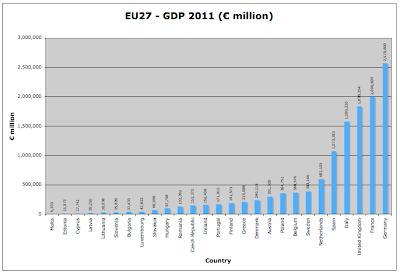 You can see that there is quite a range in economic size with the smallest economy (Malta) being less than one four-hundredth the size of the largest (Germany). Out of the EU27 nations, there are 10 that have economies that are less than €100,000 million euros in size representing 37 percent of all Member States. Four economies alone, Germany, the United Kingdom, France and Italy, account for 58.8 percent of the entire output of the European Union.
