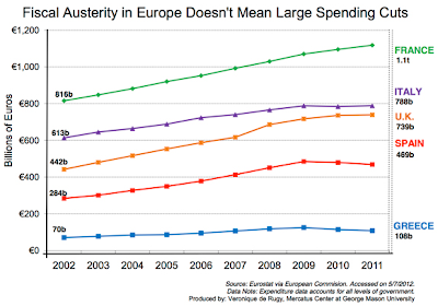 Ms. de Rugy's researchshows that, while it appears that the results of recent elections in both Greece and Spain suggest that the citizens of these countries turfed their incumbent governments because of severe cuts in spending, that is not the case. Apparently, austerity in Europe does not mean cuts in spending rather, the size of spending cuts were tiny compared to increases in taxes. Ms. de Rugy notes that spending cuts are the most important form of austerity. Increases in taxes, while helping to increase revenue, actually do not successfully reduce debt-to-GDP ratios. As well, tax increases usually have a negative impact on the guilty nation's economy.