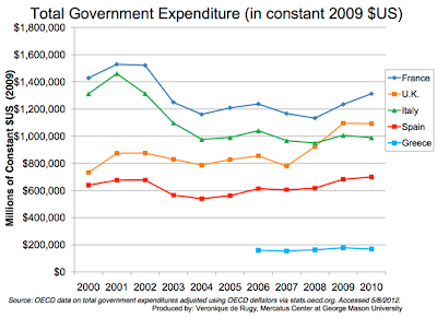 As shown on this graph, even using total government spending in constant 2009 U.S. dollars, only three of the nations, the United Kingdom, Italy and Greece, show very marginal drops in spending since the inception of the Great Recession when everything seemed to go off the rails for Europe's debtor nations: