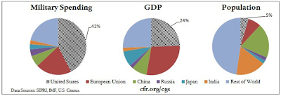 Let's step aside for a moment and look at United States spending on its military compared to other nations/groups of nations when compared relative to GDP and population: