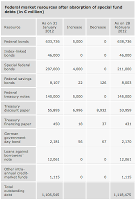 It is still very early in the fiscal year so trends in Germany's finances are relatively meaningless at this point in time. However, there is still some interesting information to be gleaned from the latest Federal Ministry of Finance Monthly Report for March 2012 and the March 2012 Federal budget key figures.