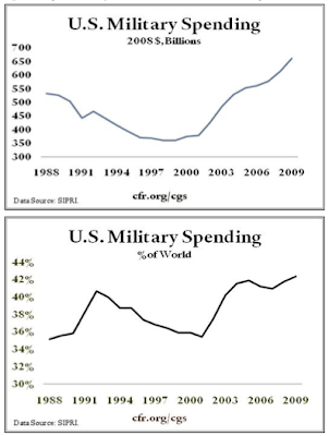 Here is a graphshowing both the inflation-adjusted U.S. military budget and how much of the world's military spending stems from Washington: