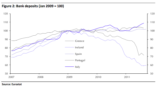 The formation of a "new euro" by the stronger northern Member States could result in a flight of capital from the weaker, departing southern Member States. Departure could also result in a run on banks, plummeting asset values (i.e. real estate), large rises in interest rates on bonds and negative impacts on consumer and business confidence. These issues would most likely rise if the departure were planned in secret rather than involving the public in a democratic decision-making process, however, even if a departure was well known by the voting public, there is no guarantee that there would not be mass bank withdrawals for example. Here is a graph showing dropping deposit levels for the PIIGS nations between 2007 and 2012, suggesting that the problem of a run on banks is far from remote, particularly for Greece and Ireland who have already suffered from a major drop in bank deposits: