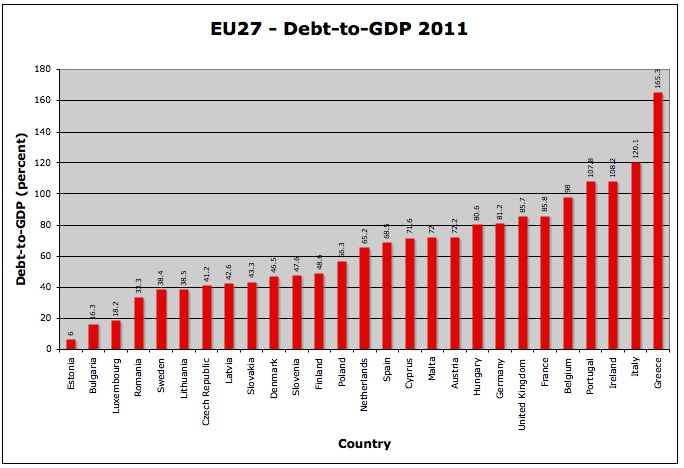 I realize that this is a rather lengthy posting, however, it is an issue that one way or another will impact all of us. In light of that, let's open by looking at the debt-to-GDP levels for Europe's Member States to the end of 2011 to put the issue into perspective: