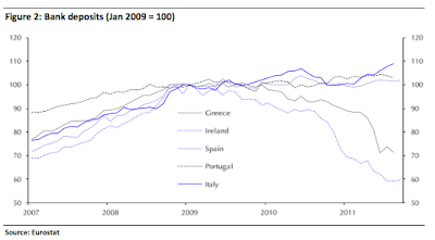 In closing, let's look at one of the big issues that will face the departing country; the collapse of the banking sector. As I showed in the graph above, both Greece and Ireland saw a collapse in the funds on deposit in their domestic banking system as their debt crises deepened. Right now, the ECB is providing liquidity to these banks so that they can keep functioning, however, this may not go on forever. Here's where the author gets into a rather frightening scenario: