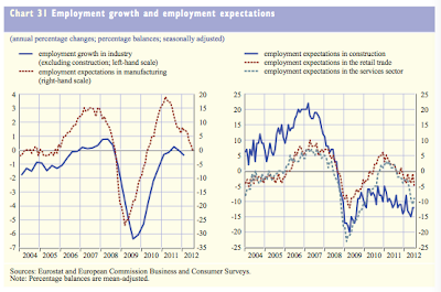 Lastly, let's look at Europe's employment picture. In June, the unemployment rate across the Eurozone hit 11.2 percent, an increase of 1.2 percentage points over a year earlier despite the fact that this is supposed to be a post-recession recovery. These two graphs show that further job losses are anticipated in both manufacturing and non-construction employment and that the losses appear to be accelerating: