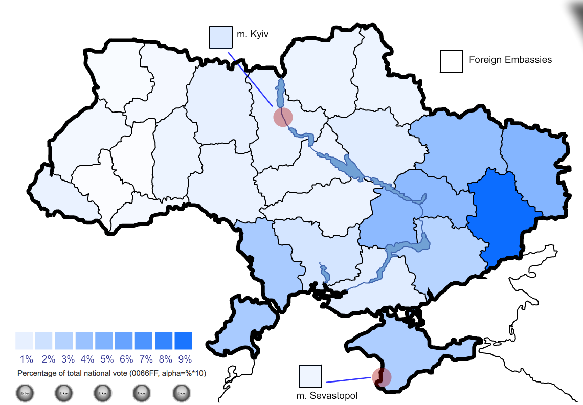 The areas in darker yellow are the regions where Ms. Tymoshenko, Ukraine's former Prime Minister, took a larger share of the vote. You'll notice that Ms. Tymoshenko was most popular in the west part (Ukrainian sector) of the country where she garnered up to 5.15 percent of the national vote and that she was least popular in the western part of the country where she received less than 1 percent of the national vote. Overall, Ms. Tymoshenko received 11593357 votes or 45.48 percent of the total. An additional 4.36 percent of voters cast their ballots "against all candidates".