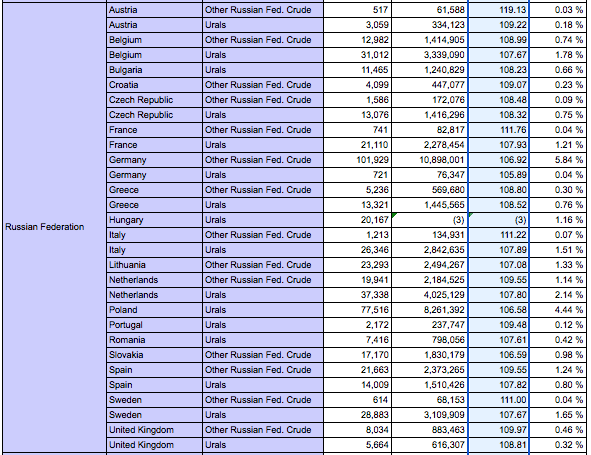 Now, let's look at Europe's oil imports. According to Eurostat, for the first half of 2014, here is how much oil Europe sourced from Russia by country: