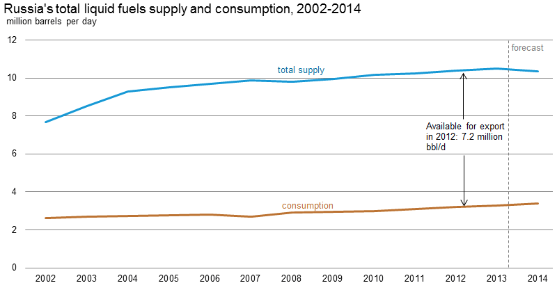 Let's open with a bit of background first. According to the United States Energy Information Administration, in 2012, Russia was the third-largest producer of oil in the world after Saudi Arabia and the United States and remained third-ranked with average production of 10.5 million BOPD through September 2013. Here is a graph showing Russia's total liquid fuels supply and consumption through 2014: